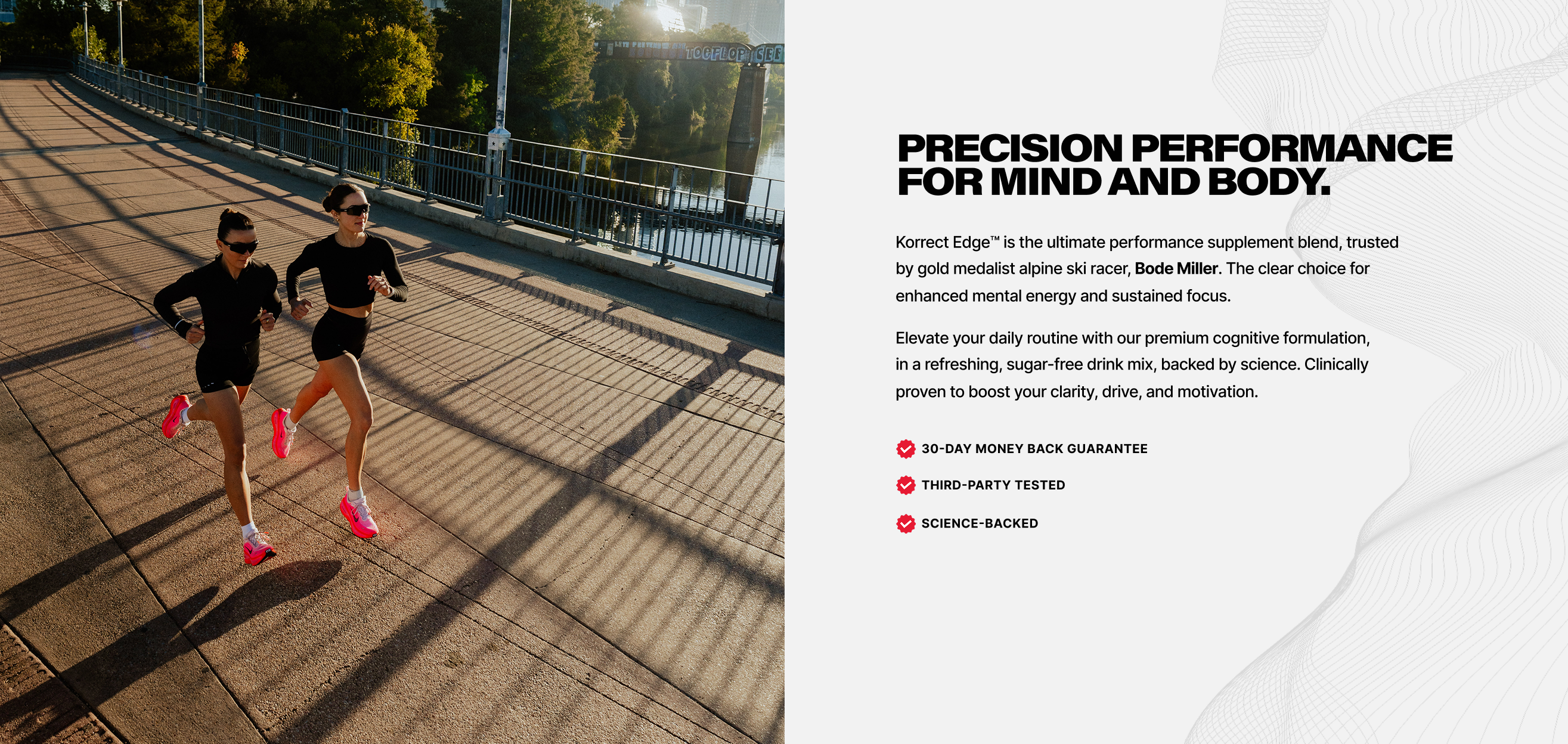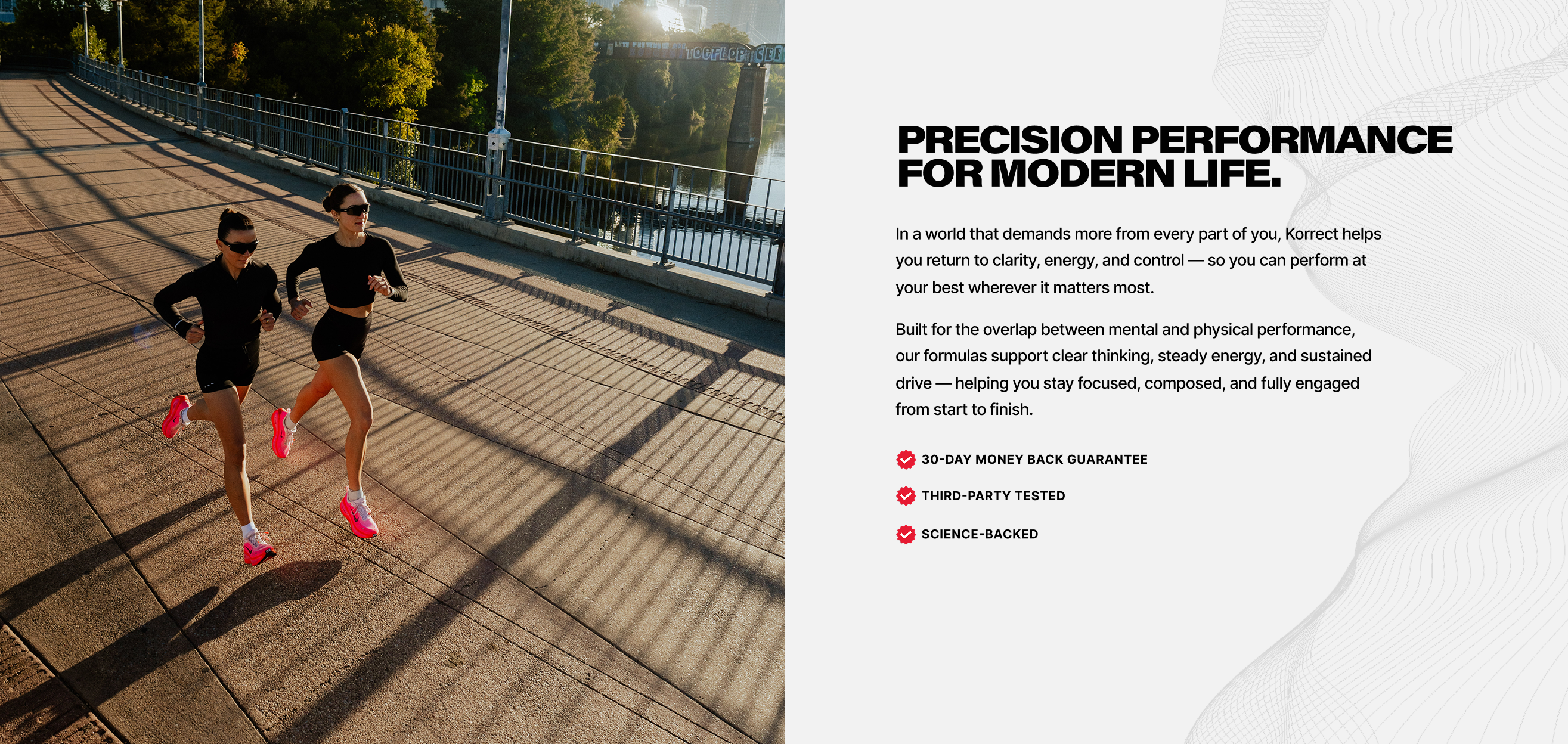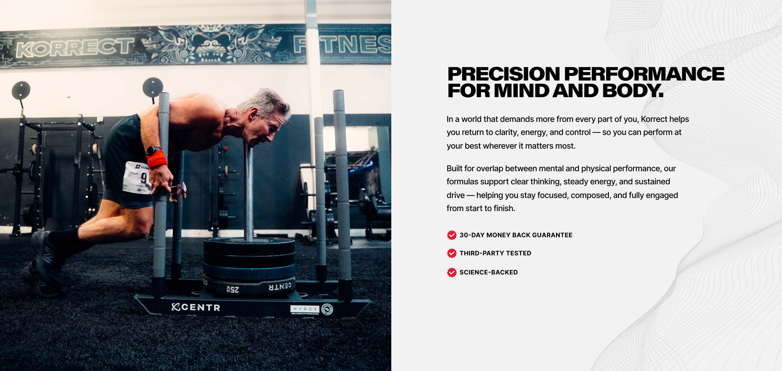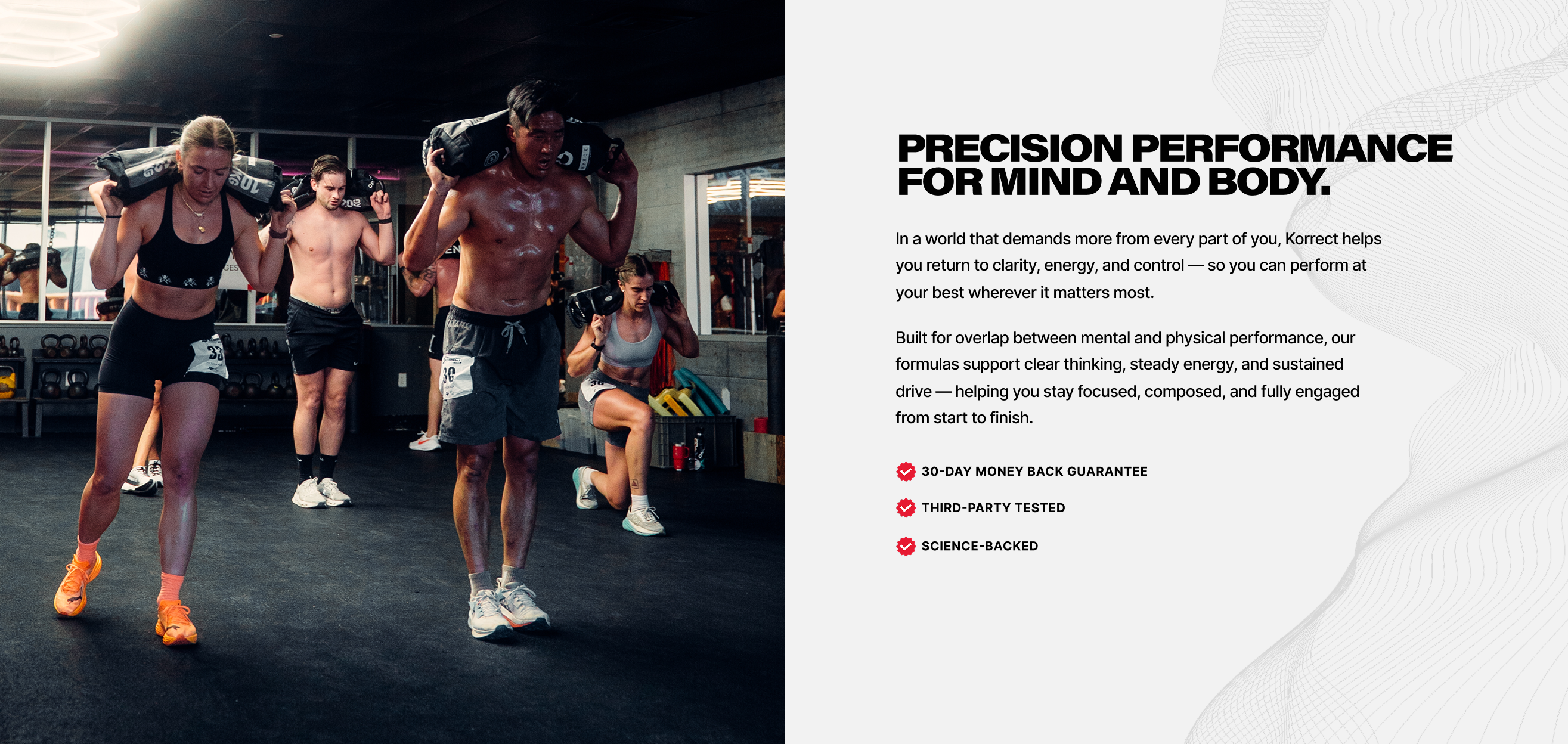 Korrect is designed for people who want to perform at a higher level in both mind and body. Our formulas support mental clarity, motivation, sustained energy, and physical performance — without the crash or overstimulation common in many products.